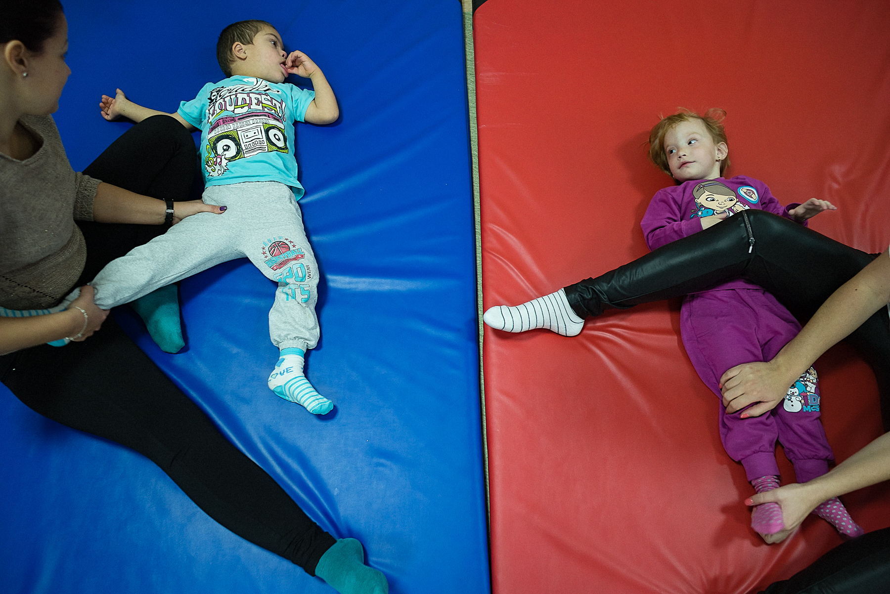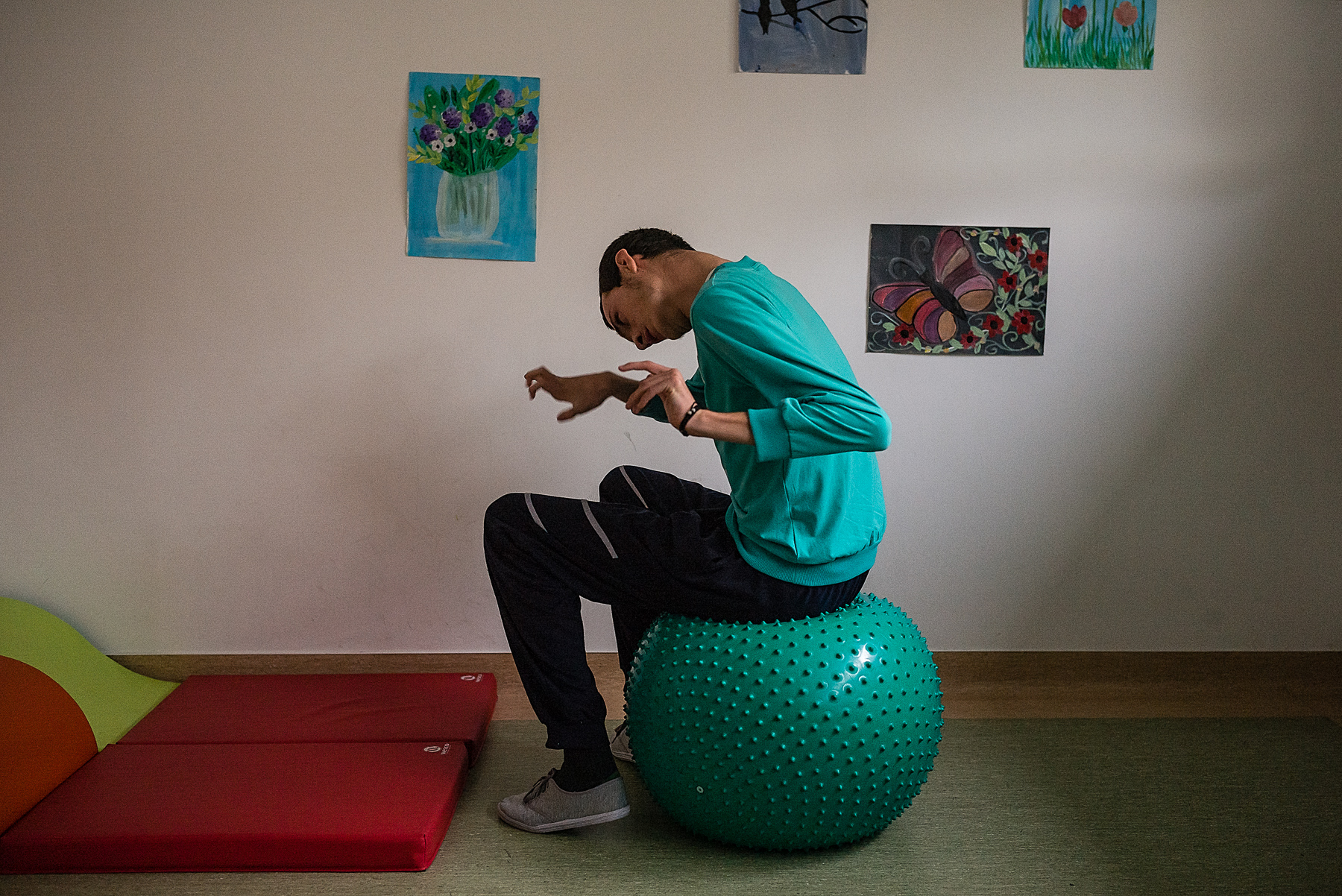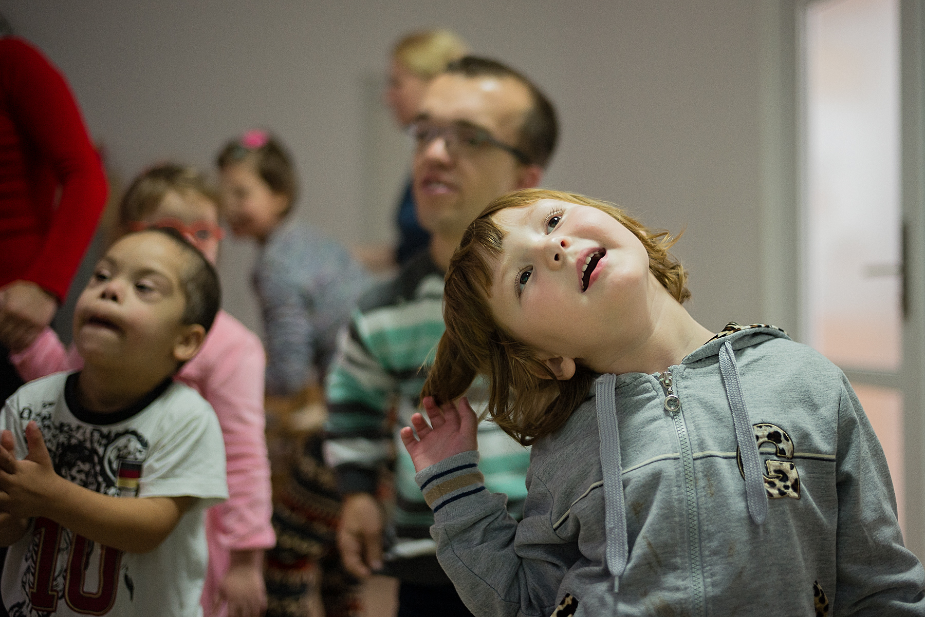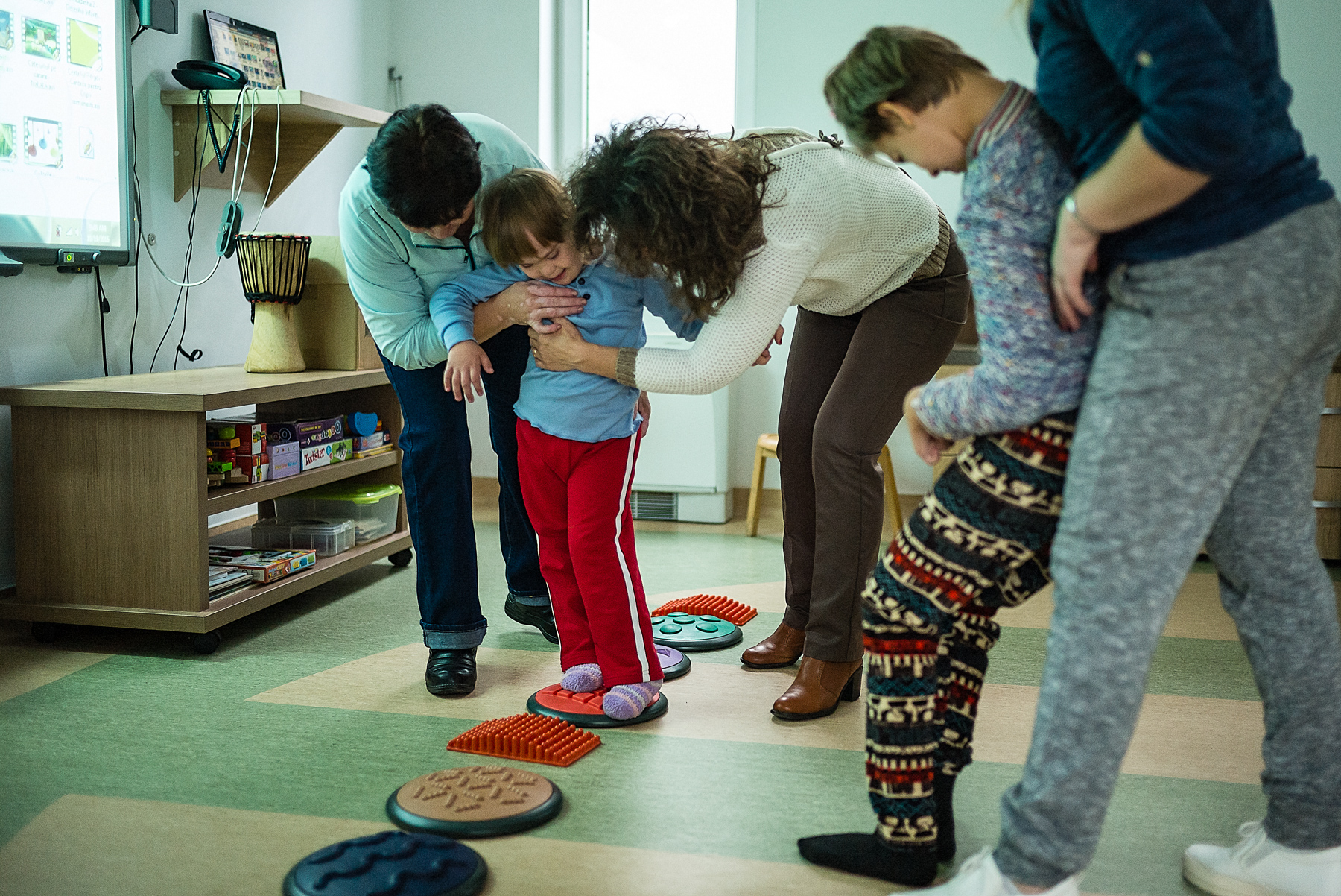 Vera o ajută pe Ali să pășească pe discurile cu texturi și culori diferite. Codrin îi așază pe Andrei și Andreea pe scăunele. Oana îi șterge Irinei saliva de pe bărbie – Irina nu poate să se miște sau să vorbească și stă într-un cărucior. Alina încearcă s-o liniștească pe Mara, care plânge și se trage de bluză. Iulia îl ia pe Mihai de lângă întrerupătorul pe care îl stinge și îl aprinde încontinuu de cinci minute. Mihai o lovește și începe să țipe. Ionuț bate din palme, se ridică, se așază, bate din palme, se ridică, se așază.