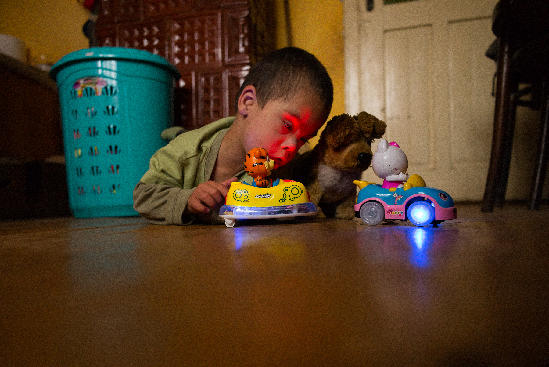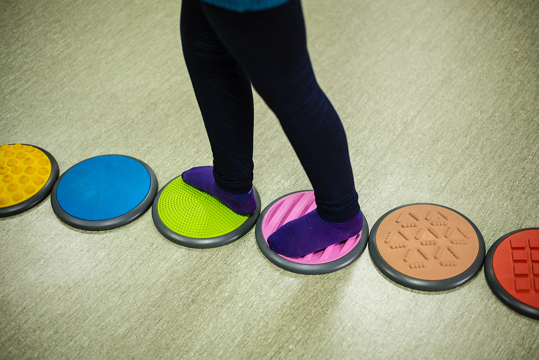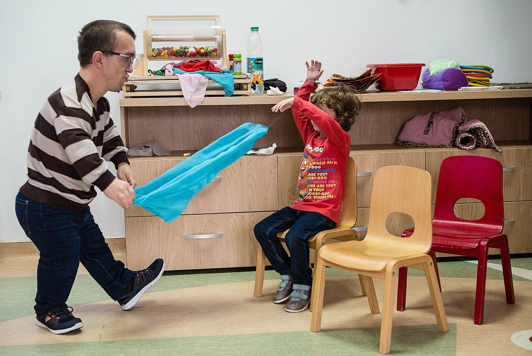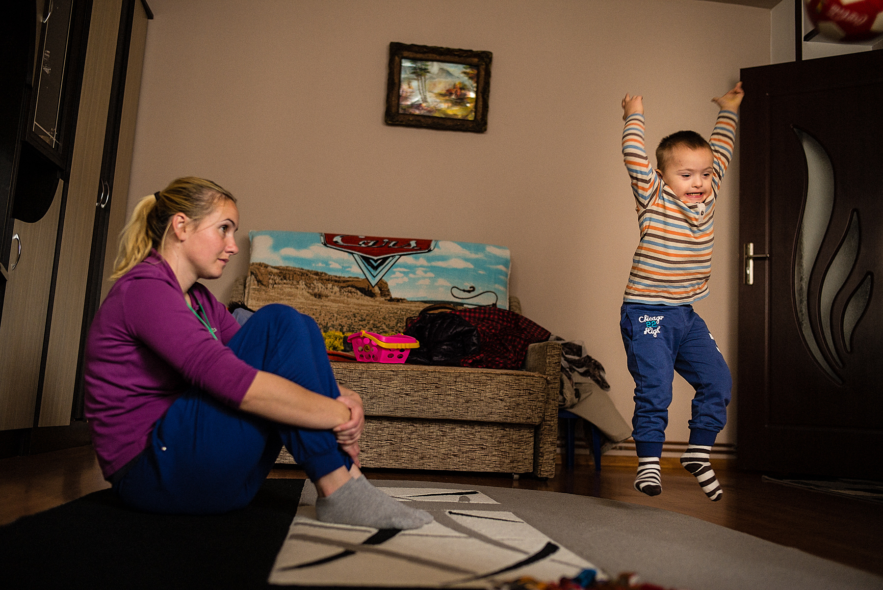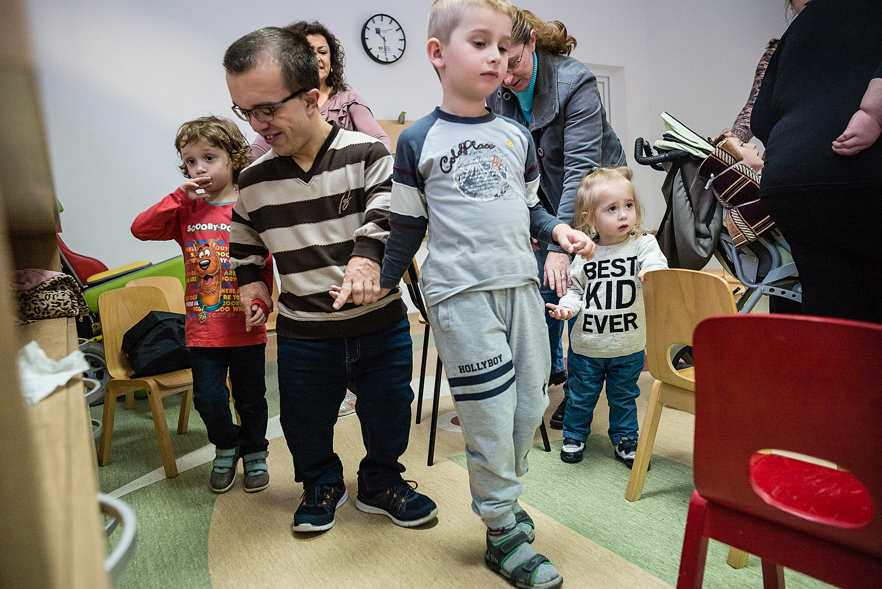 Vera o ajută pe Ali să pășească pe discurile cu texturi și culori diferite. Codrin îi așază pe Andrei și Andreea pe scăunele. Oana îi șterge Irinei saliva de pe bărbie – Irina nu poate să se miște sau să vorbească și stă într-un cărucior. Alina încearcă s-o liniștească pe Mara, care plânge și se trage de bluză. Iulia îl ia pe Mihai de lângă întrerupătorul pe care îl stinge și îl aprinde încontinuu de cinci minute. Mihai o lovește și începe să țipe. Ionuț bate din palme, se ridică, se așază, bate din palme, se ridică, se așază.