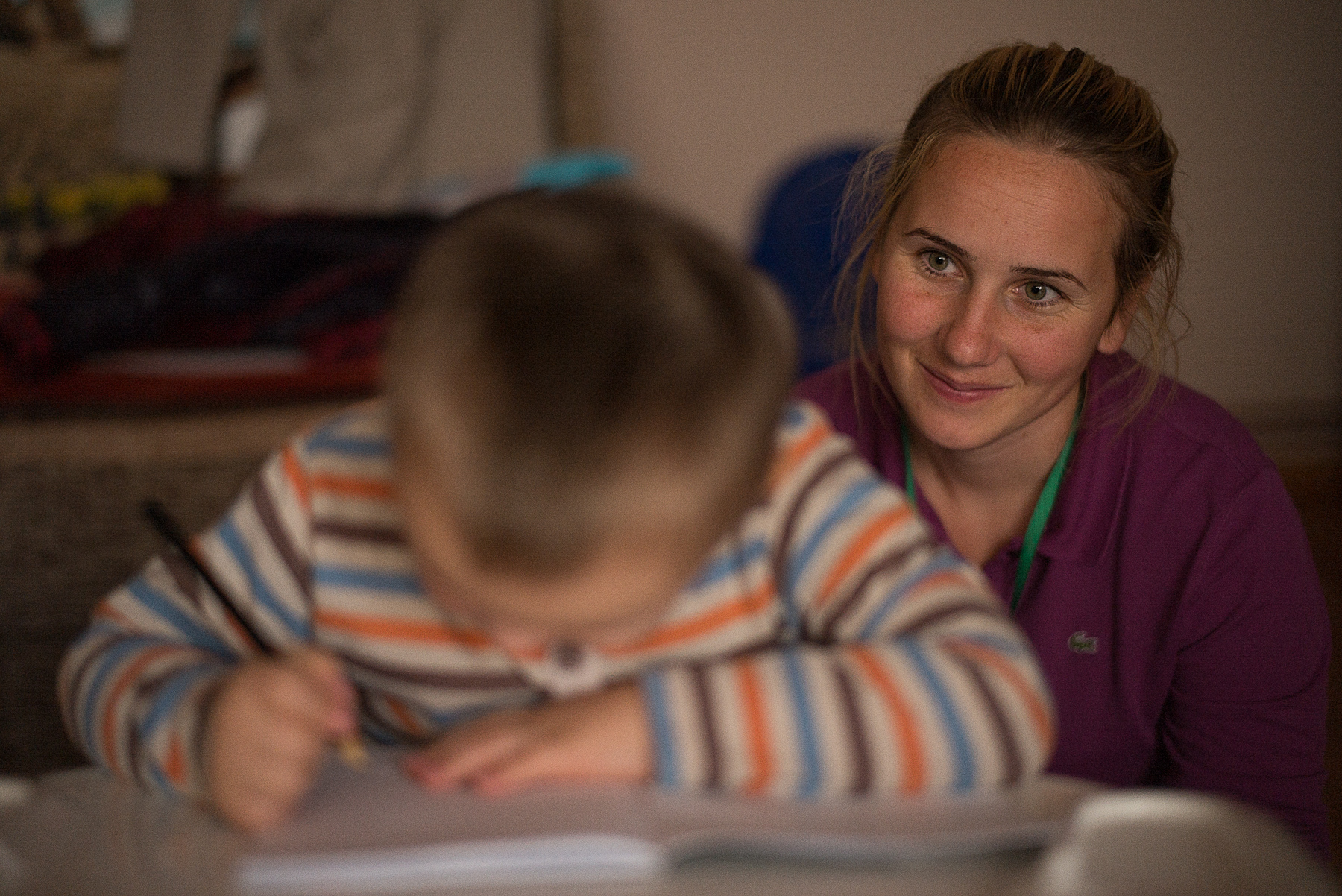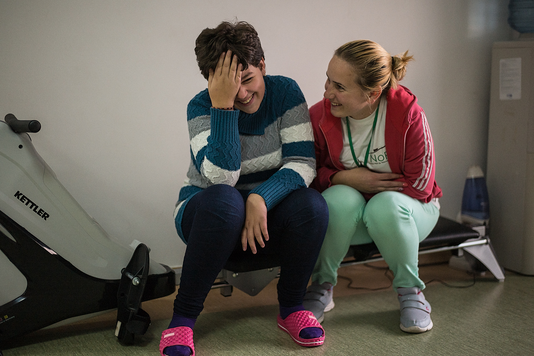 Oana Dan, 31 de ani, este voluntar la Centrul NoRo. Oana are Sindrom Prader Willi. Veronica Ionuțaș, Vera, 42 de ani, este pedagog și face terapie prin joc – ergoterapie – cu copiii care vin la Centrul NoRo. E ajutată de Iulia și de voluntari.