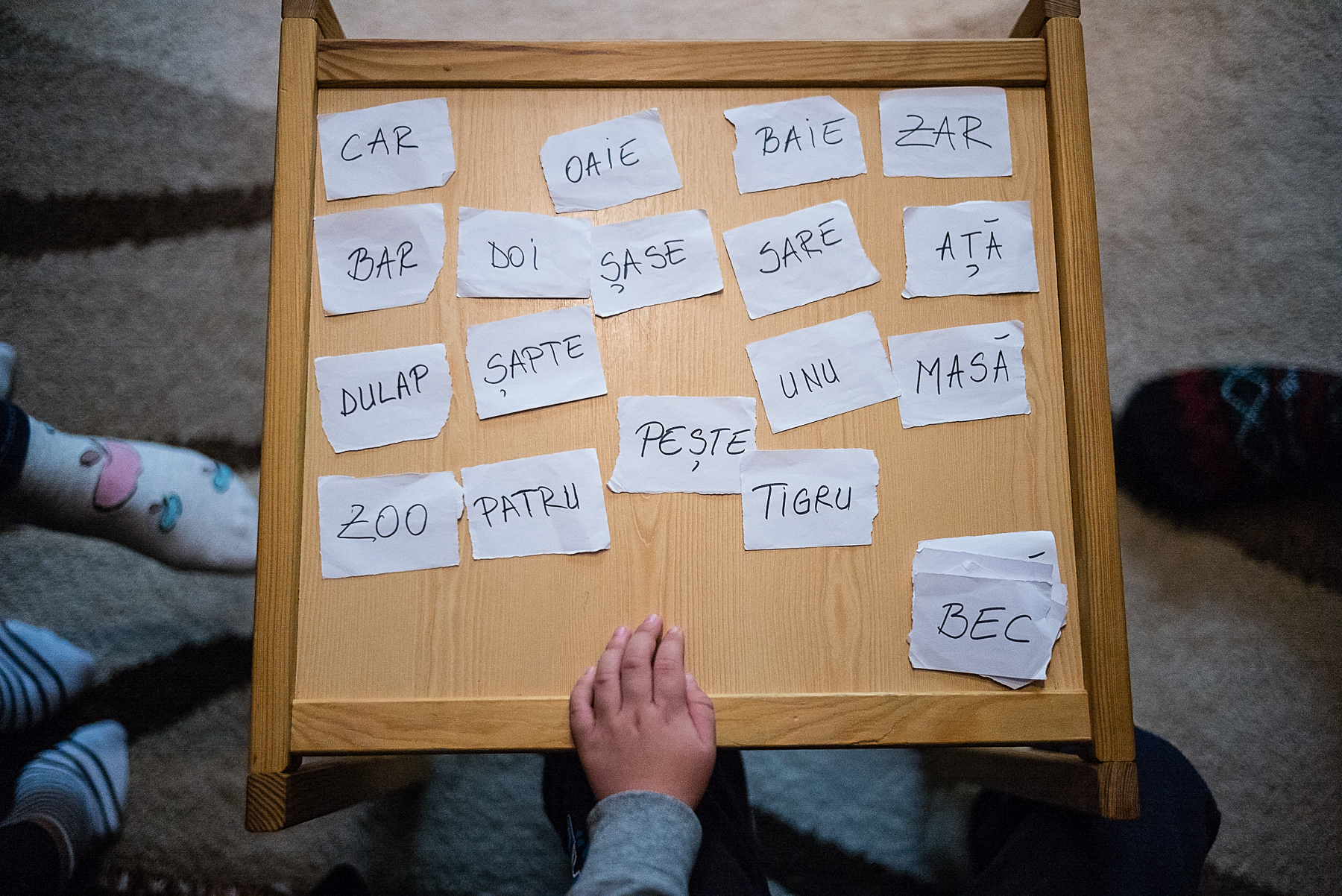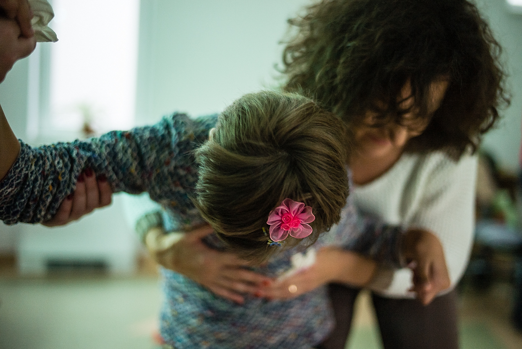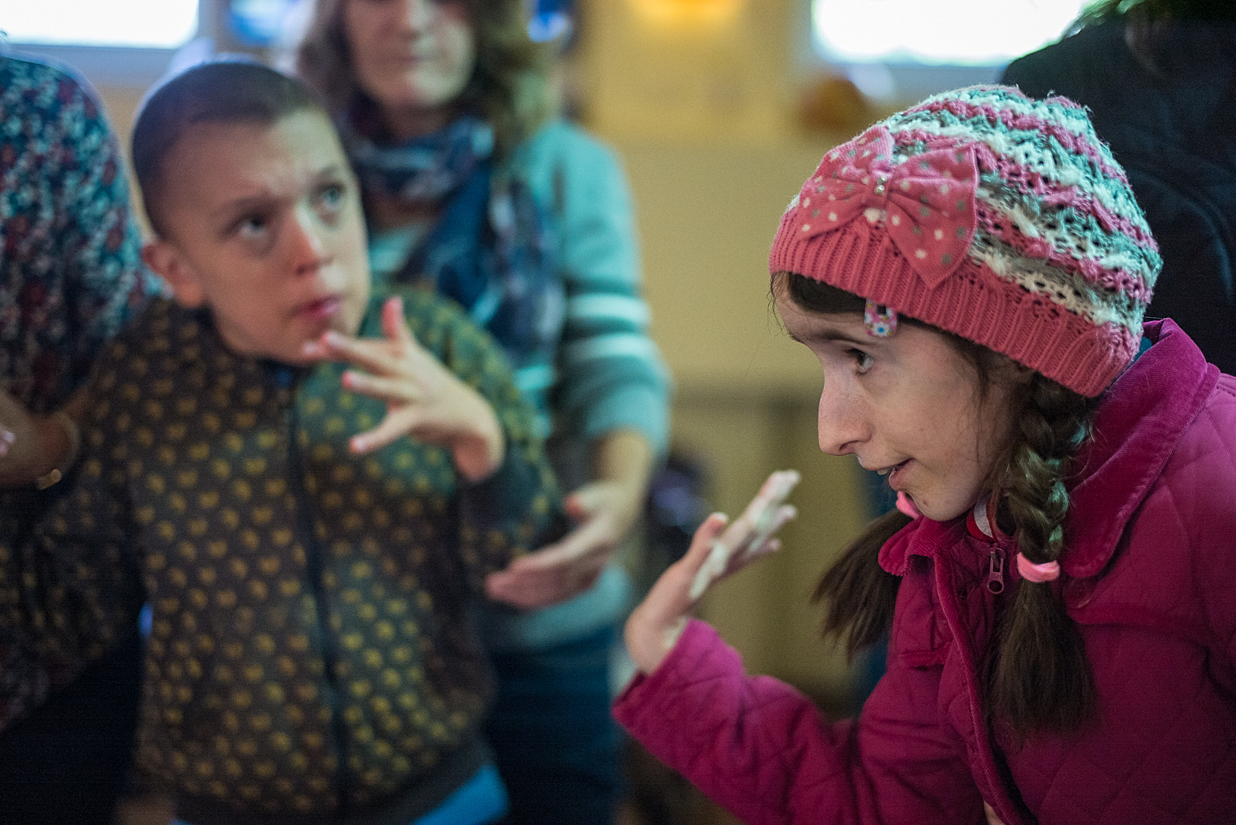 Cei mai mulți copii nu pot lucra singuri, așa că Vera, Iulia, Codrin și Adina le iau mâinile și le conduc la nas, la ochi, la burtă, niște mâini de sprijin care manevrează niște mânuțe de copii păpuși.