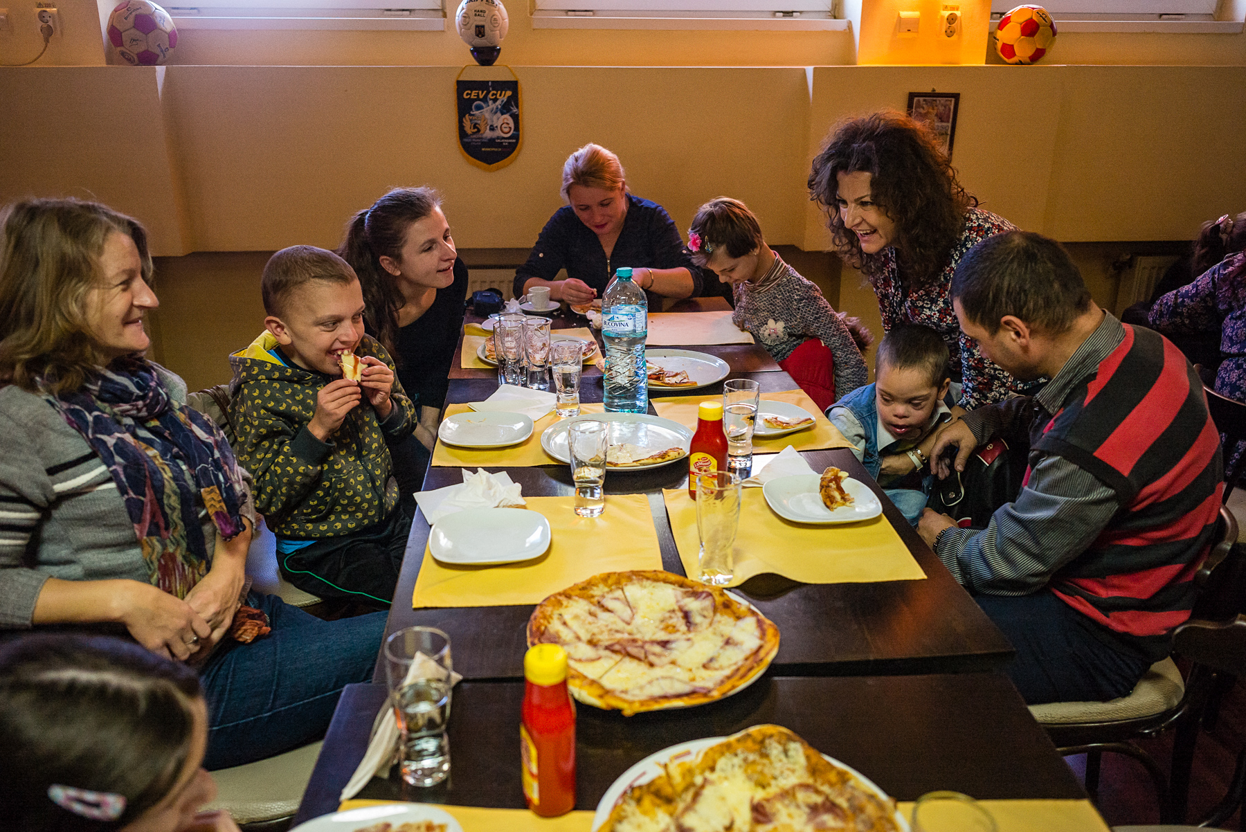 Copii, părinți, câțiva voluntari de la Centrul NoRo, coordonați de Vera, și un zumzet vesel umplu partea din spate a restaurantului din Zalău, unde două rânduri de mese au fost lipite ca să încapă toți. Copiii de la NoRo au fost invitați astăzi la pizza împreună cu părinții lor – centrul organizează astfel de ieșiri ca să încurajeze familiile să socializeze și să-și scoată copiii din case.