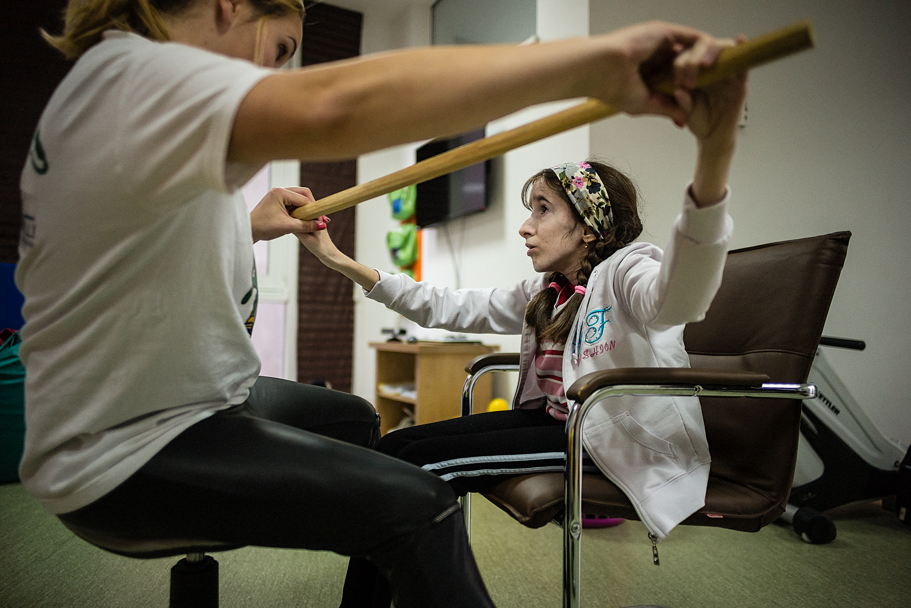 Denisa ridică mingea, o aruncă, calcă pe discurile tactile. Când a venit prima oară aici, Denisa nu urca scările singură. Acum urcă pe spalier și ia mingea pe care Rebi a pus-o pe ultima bară. O aruncă, apoi coboară, o ridică și o pune în coș. Rebi o așază pe Denisa pe mingea pentru aerobic. Denisa începe să plângă.